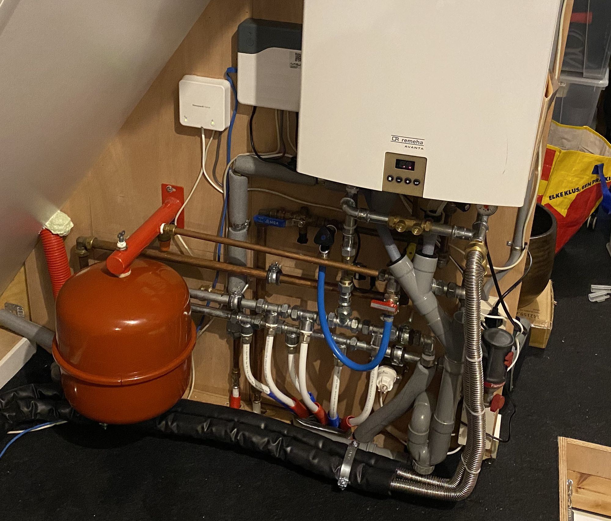 Na alle voorbereidingen en het plaatsen van de Quatt zelf is het tijd voor het doorvoeren van de leidingen en het daadwerkelijk aansluiten. Dit was gezien de toch wat krappe ruimte en de extra uitdaging van het doorvoeren tussen het plafond en de vloer misschien het lastigste deel van de plaatsing in ons geval. Met de nodige kleine aanpassingen is het uiteindelijk in ieder geval gelukt om de route zoals ik die voor ogen had te volgen.
